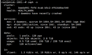 文章目录[隐藏] 前言 集群配置 开始测试 前言 最近在折腾CEPH集群,测试环境是4台ceph物理节点,每台8~12个SATA/SAS机械硬盘,共43个OSD。性能远低于预期,目前正在调整配置中...... 正好实测了一下性能,这里分享出来大家参考。对CEPH Pool的性能测试可以看前一篇: 集群配置 4 CEPH节点:SH-1001 SH-1003 SH-1004 SH-1005 2Manager:SH-1001 SH-1005 3Monitor:SH-1004 SH-2001 SH-2003 开始测试 内网测速 root@SH-1005:~# iperf3 -s ----------------------------------------------------------- Server listening on 5201 ----------------------------------------------------------- Accepted connection from 10.1.0.1, port 42784 [ 5] local 10.1.0.5 port 5201 connected to 10.1.0.1 port 42786 [ ID] Interval Transfer Bitrate [ 5] 0.00-1.00 […]