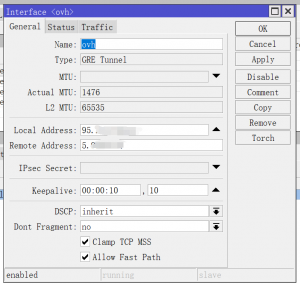 RouterOS端,公网IP 95.x.x.x/32,tunnelIP 192.168.100.2/30,内网IP 10.0.0.1/8