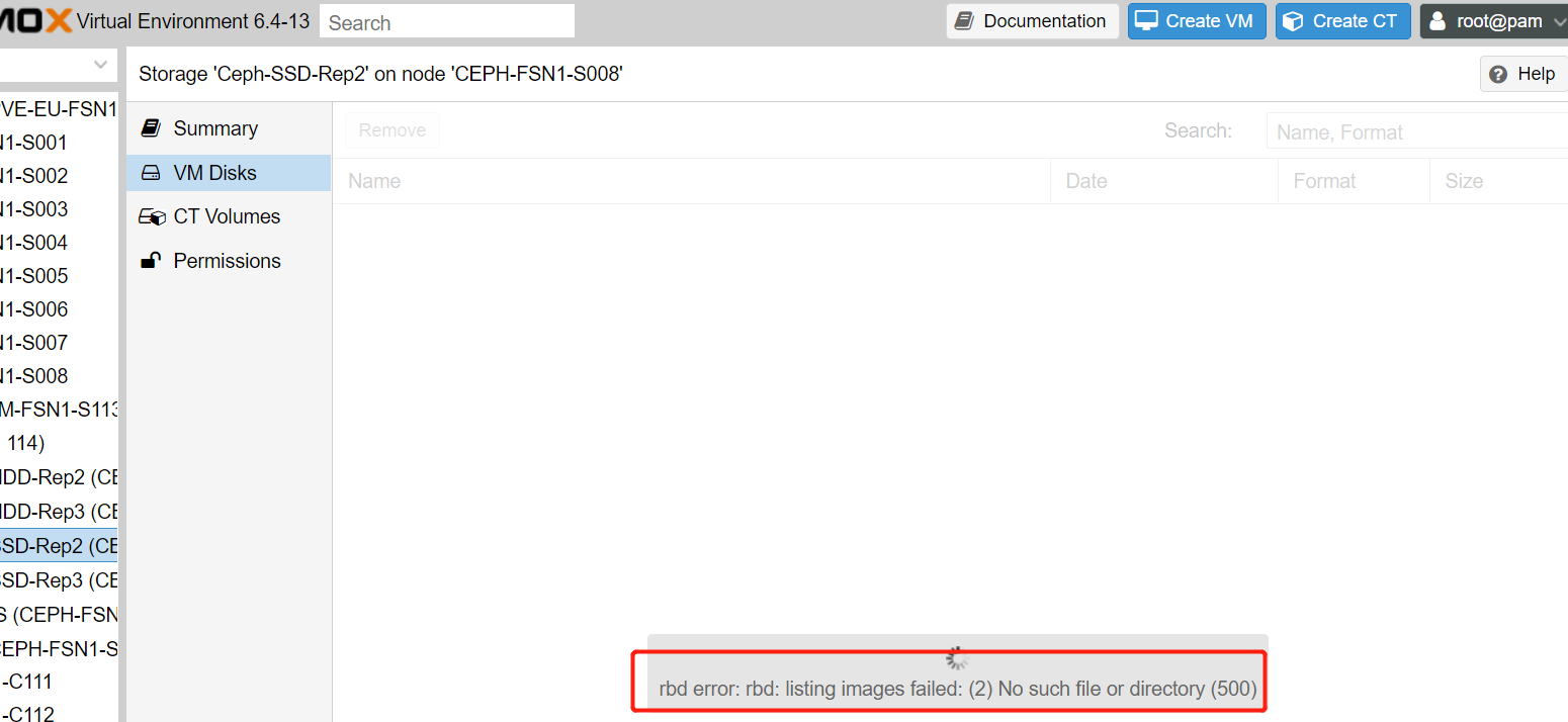 上面这个报错是GUI下的,如果在cli中输入rbd ls -l Ceph-SSD-Rep2(其中Ceph-SSD-Rep2是cephpool名),则会出现这样的提示: