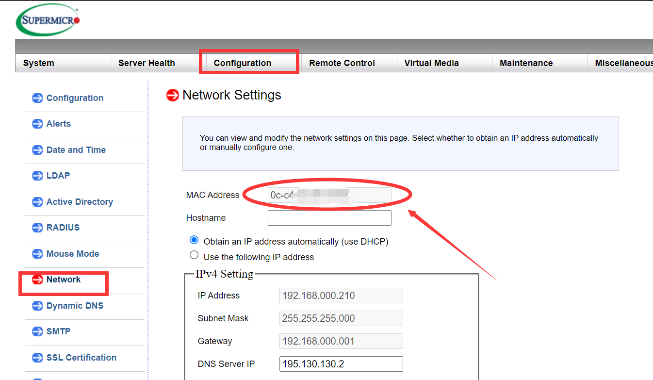1. 首先在IPMI》configuration》network中找到IPMI的MAC地址,形如0c-c4-xx-xx-xx-xx: