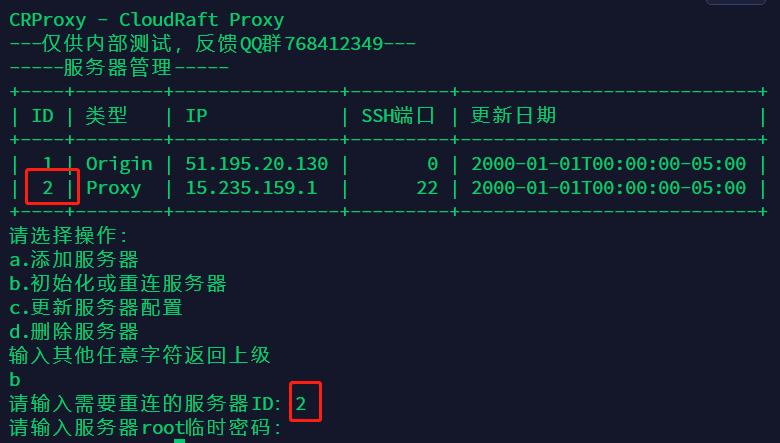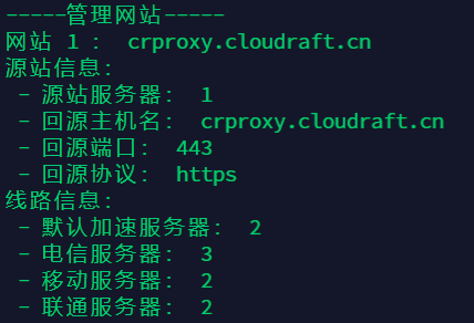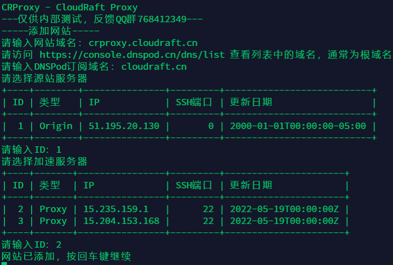 然后根据提示依次选择源站服务器和默认加速服务器,本例中源站服务器ID为1,默认加速服务器ID为2