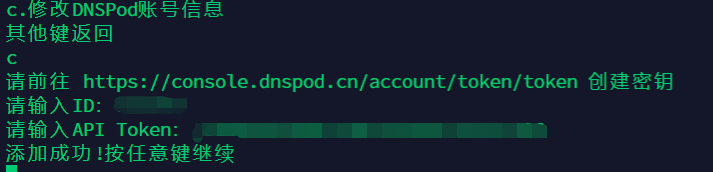 进入【c.修改DNSPod账号信息】,分别填写ID和Token测试通过后会保存: