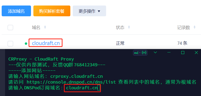 依次进入【b.网站管理】>>【a.添加网站】,输入网站的域名,本例中为crproxy.cloudraft.cn,然后输入DNSPod对应的订阅域名,本例中为cloudraft.cn