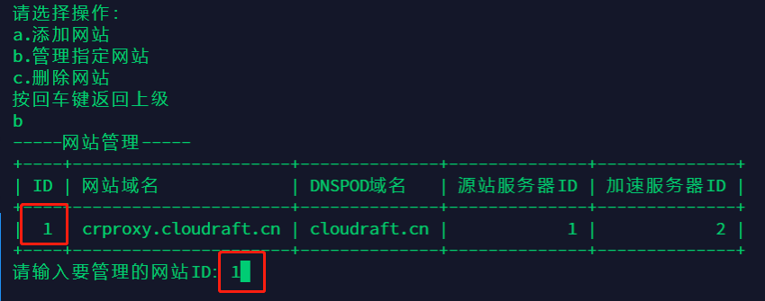 依次进入【b.网站管理】>>【b.管理指定网站】,输入需要管理网站的ID,本例中为1