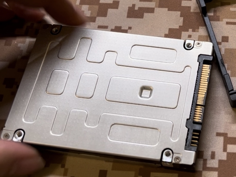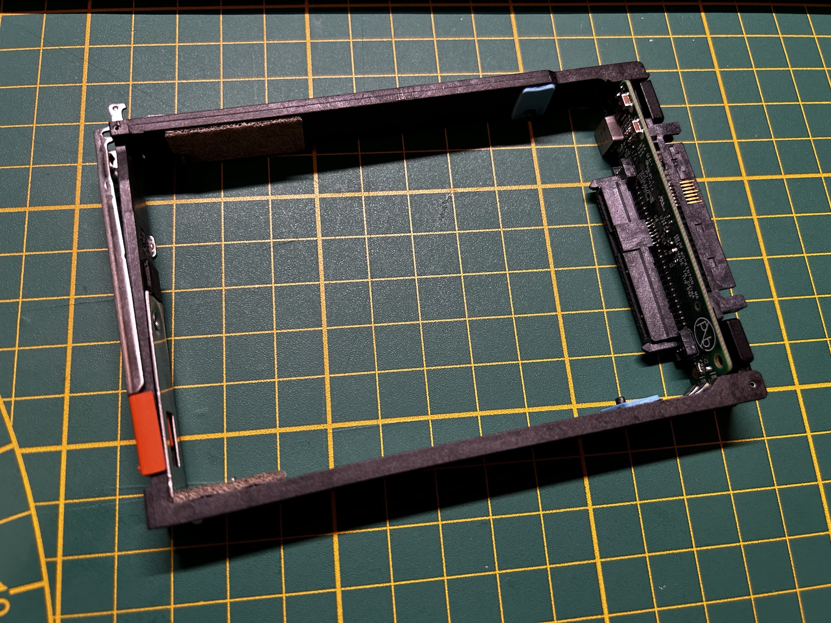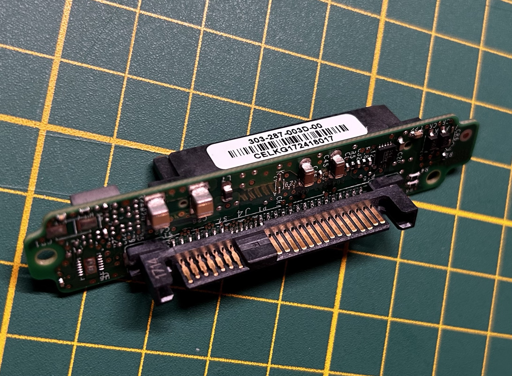 但是这个硬盘的接口是图中这样的,中间7根金手指不是在背面而是在正面,和我见过的其他SAS盘不一样。同时它还附带了一个转接框,把中间的金手指转换到背面。