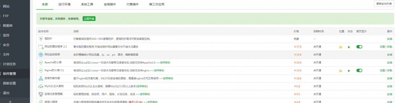 宝塔面板BT现在提供了一系列付费插件,比如:网站防篡改程序 网站监控报表 2.5 Apache防火墙 Nginx防火墙 宝塔负载均衡 1.5 MySQL主从复制 宝塔任务管理器 1.2 宝塔数据同步工具