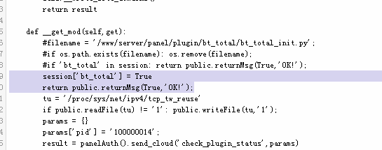 if \'bt_total\' in session: return public.returnMsg(True,\'OK!\');