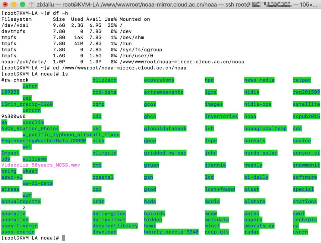 [root@KVM-LA ~]# df -h Filesystem Size Used Avail Use% Mounted on /dev/vda1 9.6G 2.3G 6.9G 25% / devtmpfs 7.8G 0 7.8G 0% /dev tmpfs 7.8G 16K 7.8G 1% /dev/shm tmpfs 7.8G 41M 7.8G 1% /run tmpfs 7.8G 0 7.8G 0% /sys/fs/cgroup tmpfs 1.6G 0 1.6G 0% /run/user/0 noaa:/pub/data/ 1.0P 0 1.0P 0% /www/wwwroot/noaa-mirror.cloud.ac.cn/noaa
