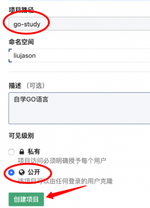 然后填写项目名“go-study”或者自己取一个名字,可以使用英文字母和下划线/中划线;之后选择为“公开”项目,这样方便我们直接部署到云筏容器云平台。