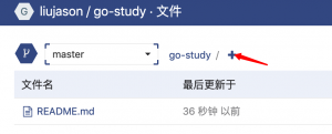 回到项目的根目录下(如:https://git.code.tencent.com/liujason/go-study,替换为自己的地址),可以看到刚刚添加的README.md文件,在上方有一个加号,点击即可创建一个新的文件。