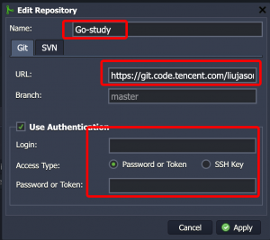 选择Git,然后点击Add New,然后填入名称和腾讯工蜂中创建的项目git链接(如我创建的是:https://git.code.tencent.com/liujason/go-study.git),使用账号密码/sshkey进行身份认证,如果是微信登录的腾讯工蜂需要新建sshkey,不会的话去问小汤吧或者大家自己交流一下。