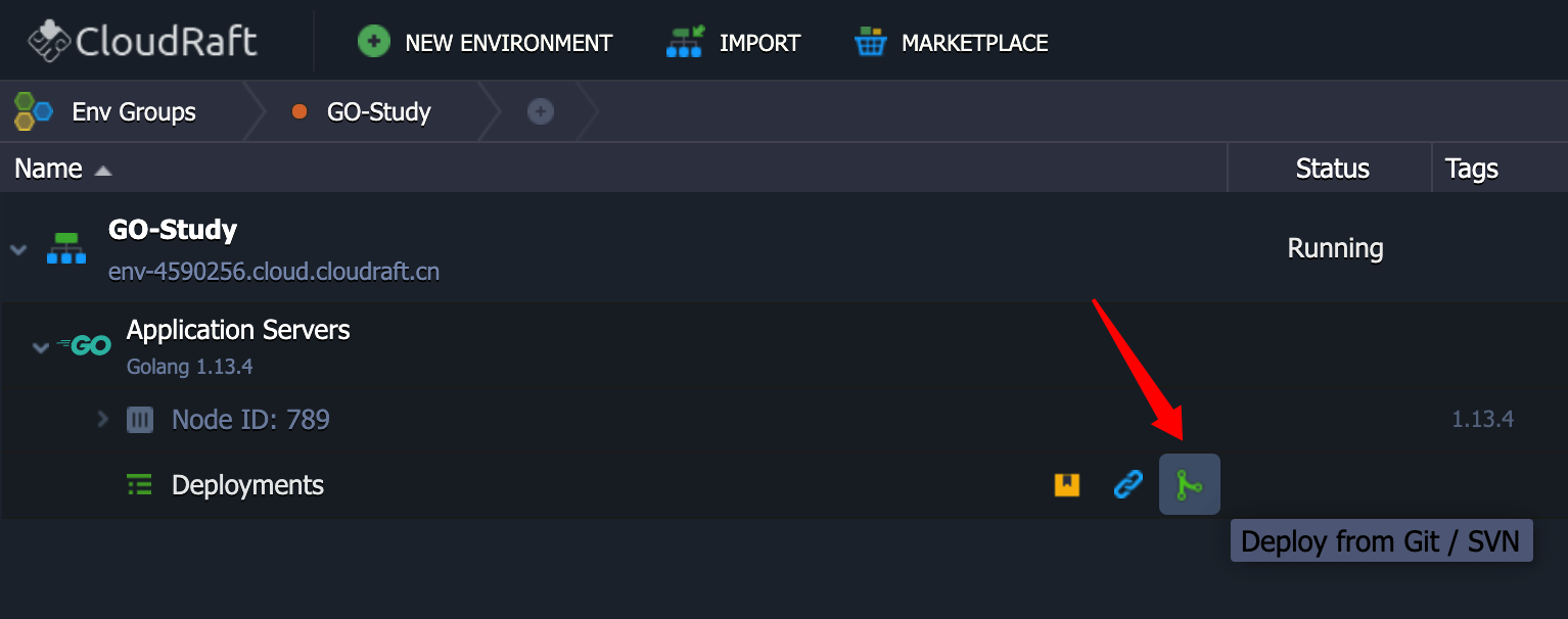 回到云筏容器云平台(app.paas.cloudraft.cn),看到之前我们创建的GO环境,点击Deployments行的小图标: