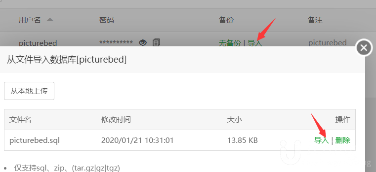 宝塔中添加数据库picturebed,记录下数据库的账户密码。使用宝塔内置的功能导入picturebed.sql。