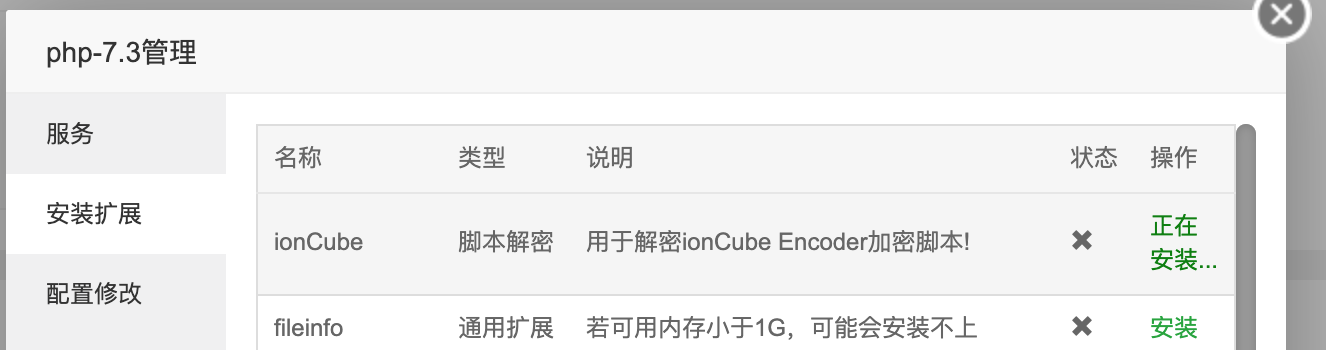 3. 支持的PHP版本为7.1~7.3,另外需要安装ionCube扩展
