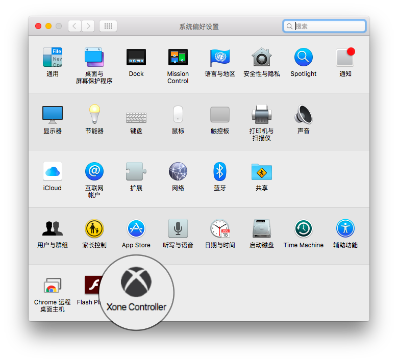 重启完毕后,找一根普通的 Micro USB 的连接线, 通过 USB 将你的 Xbox One 手柄与 Mac 连接,如果刚刚的驱动程序安装成功的话,你应该能顺利的在系统偏好设置中看到最下面多出来了一个名为「Xone Controller」的项目。