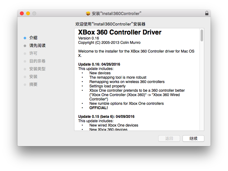 前往这个页面,下载名为「360ControllerInstall_0.16.dmg」的驱动文件并安装,安装完成后会提示重启电脑。