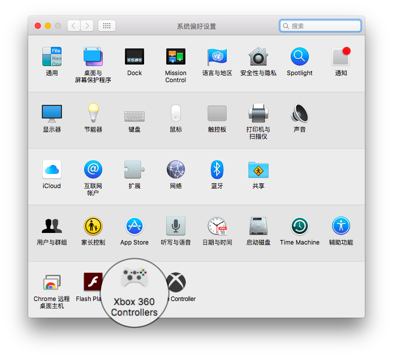 整个的设置过程其实与 Xbox One 手柄的没什么不同,在安装并重启完成后,在系统偏好设置中会多出来名为「Xbox 360 Controllers」 的项目。
