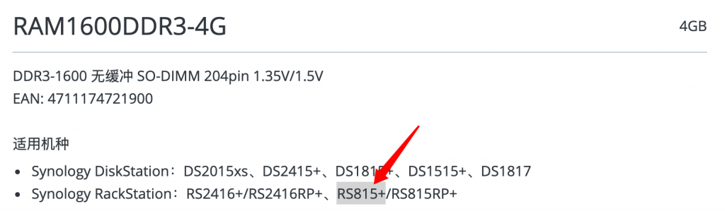 接下来,转到产品-> RAM套件https://www.synology.com/zh-cn/products/accessories/ram_railkit