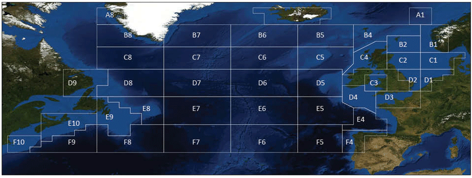 CPR将大西洋海域根据纬度划分为A-F六个纬度带,再根据经度划分为多个区域,具体划分图如下: