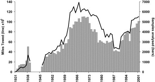 上图是截止2001年,每年的CPR采样长度和样品数量情况,二战期间停了一段时间。