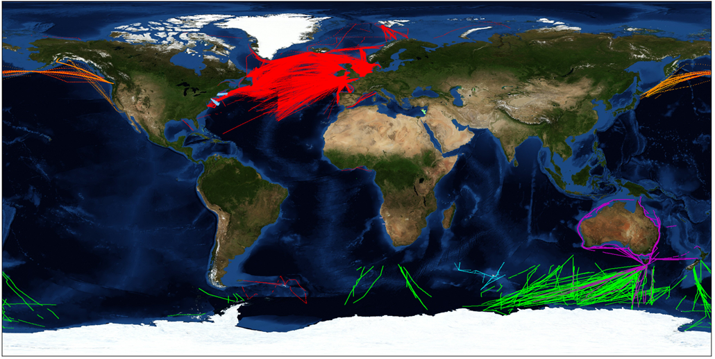上图是1995-1999年的站点分布情况,下图是2011年成立全球联盟后的数据站点情况。可以看出站点数量是在逐渐增加的,但是也意味着现在的一些站点没有较长的历史数据,如果想要做长时间跨度的对比研究的话,就需要找那些有老站点了(通常北大西洋区域的数据都是时间跨度很长的)。