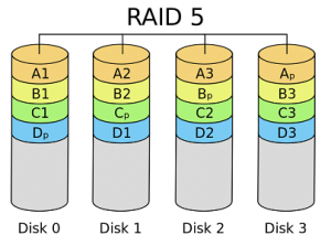 raid5或raidz会与数据一起分发奇偶校验,并且在RAID失败之前可能会丢失一个物理驱动器。因为需要计算奇偶校验,所以raid 5比raid0慢,但是raid 5更安全。 RAID 5至少需要三个硬盘,其中一(1)个完整磁盘空间用于奇偶校验。
