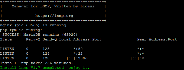 安装LNMP一键包花了236分钟,CPU性能比较弱,大概和积分用完的lightsail差不多。一般的1C1G机器大概会跑100分钟到130分钟左右(除了某些疯狂超售的)。