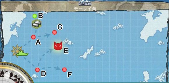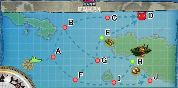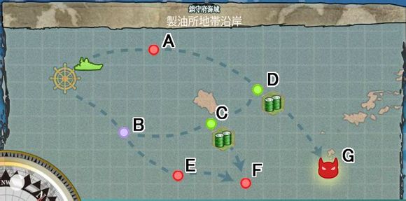 BOSS点同样掉落金刚级战列舰金刚、比睿、榛名、雾岛。值得注意的是,该BOSS点掉落正规航空母舰,【加贺】、【苍龙】。由于正规航母通过建造非常难以获得(笔者在初期曾按航母配方油300/弹30/钢400/铝300建造了15次空母,连一艘正规空母都没得到,只获得了轻空母瑞凤),因此想入手正规航母的初期玩家可以尝试反复攻略该点来获得。本地图的特点是通往BOSS点的路线非常简短,可从E点直接到达,并获取铝15~35不等。