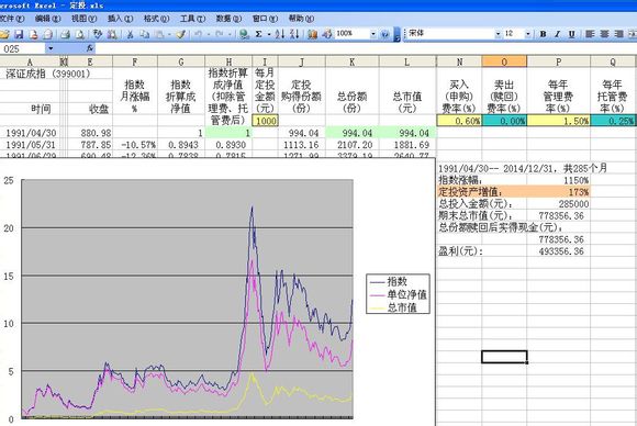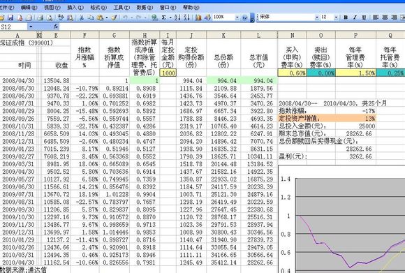 由于开放式鸡精经常碰到分红、分拆,给定投统计带来麻烦,故用深成指的历史数据,按比例折算成净值,按月在净值里扣除管理费、托管费,并且考虑了申购费、赎回费,模拟成一个零误差的指数鸡,每月最后一个交易日定投1000元。