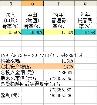 看看长期定投结果怎样,1991/04/30– 2014/12/31,头尾共285个月